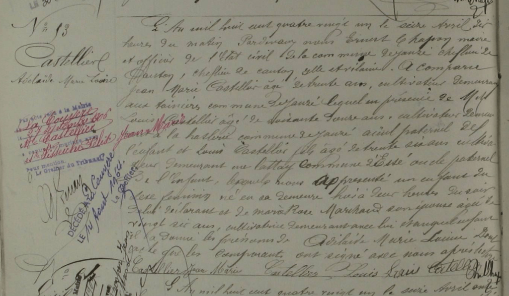 Adélaïde Castellier est la fille de Jean Marie Castellier et de Marie Rose Marchand. Elle est née le 15 avril 1881 à Janzé (35).