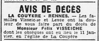 Félix Visseiche est le fils de Jean Marie Visseiche et de Jeanne Marie Chevrel. Il est né le 26 janvier 1880 à La Couyère (35).