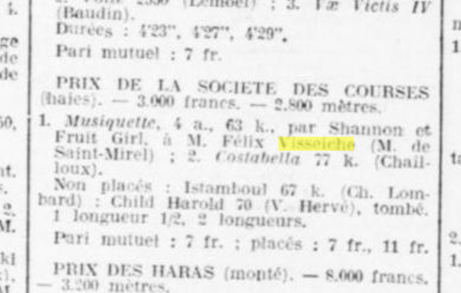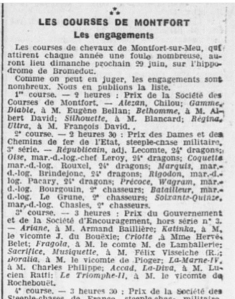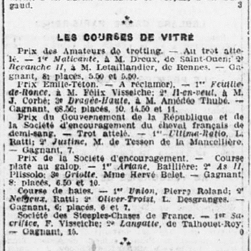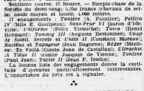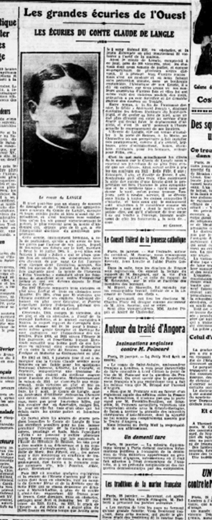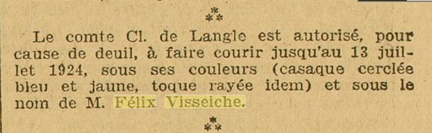 Pendant quelques semaines, il va monter en course pour le nom du Comte de Langle qui est en deuil (article du Paris-Midi du 24 mai 1924)