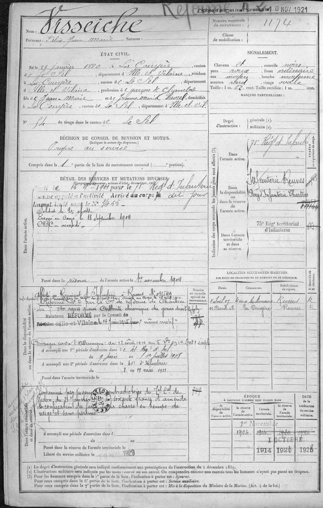Il fera ensuite 2 périodes d’exercice au 71 ème régiment d’infanterie de Rennes en 1908 et 1911
