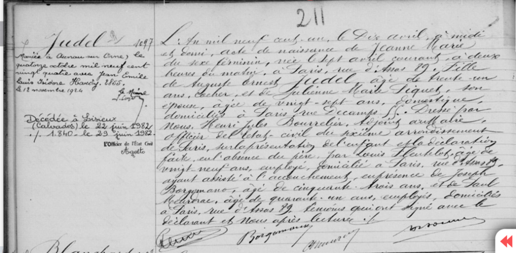 alors que le couple habite dans le 16ème arrondissement Julienne accouche à la clinique d’Assas au 89 rue d’Assas dans le 6ème. Cette clinique était un centre d’accouchement et de prise en charge des parturientes et de leurs enfants. La déclaration de naissance sera faite sans la présence du père 3 jours après.