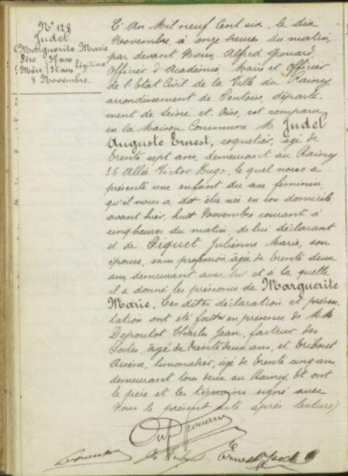 Marguerite, Marie est née au Raincy en Seine et Oise le 8 novembre 1906. Elle y est décédé le 10 novembre à l’âge de 2 jours.